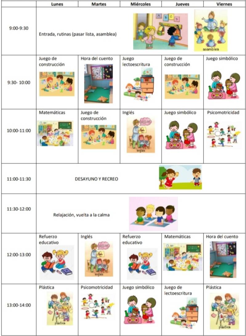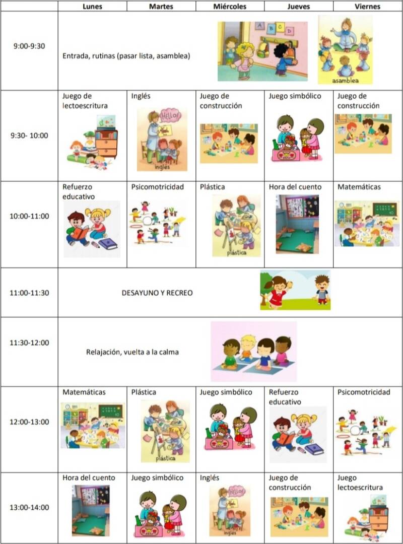 | 9:45-10:30 | Matemáticas | Inglés | Matemáticas | Educación Artística | Lengua |